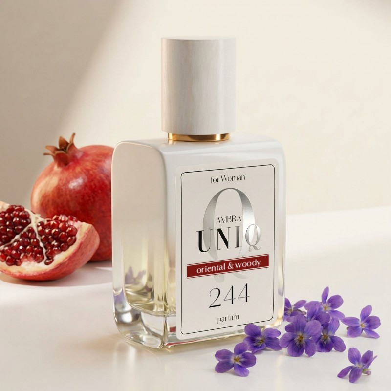 W 244. Ambra UNIQ dominują akordy owocowe, orientalne i kwiatowe, uzupełnione o kremowe, drzewne i balsamiczne niuanse.