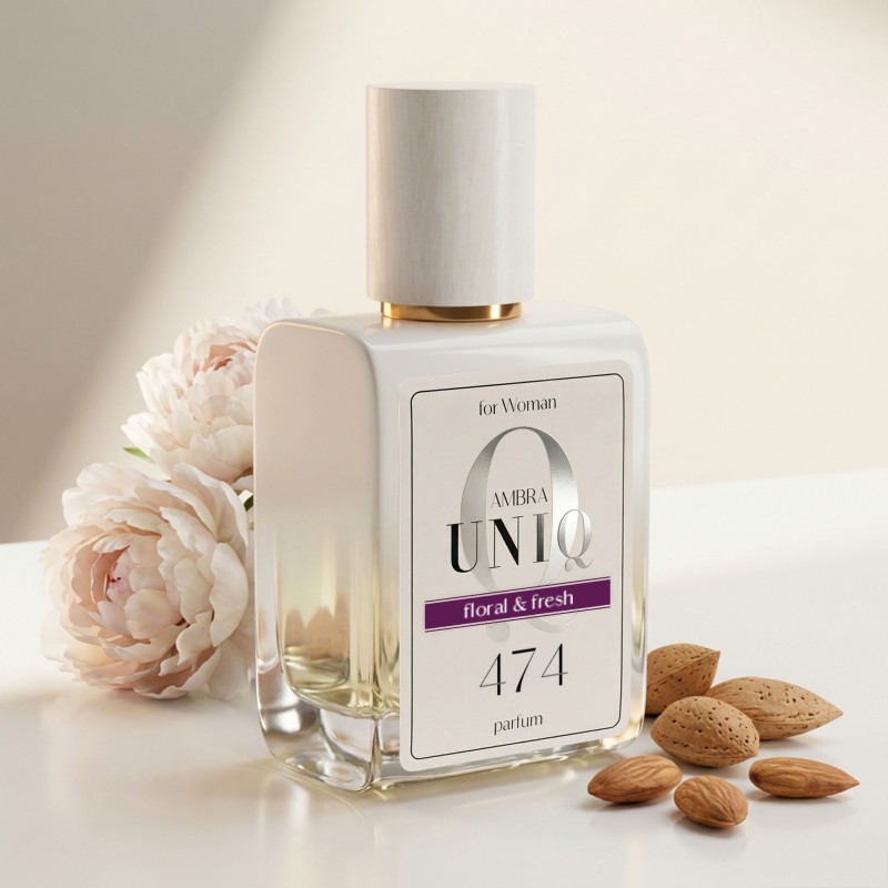 W 474. Ambra Uniq akordom kwiatowym i waniliowym towarzyszy świeża cytrusowość oraz delikatna migdałowa słodycz. Zapach jest lekki, aromatyczny i kremowy, z subtelnym drzewnym tłem.